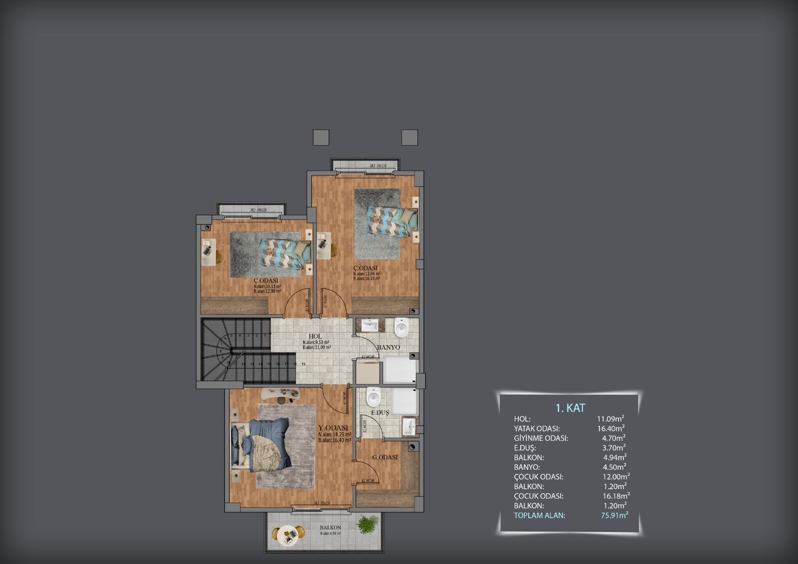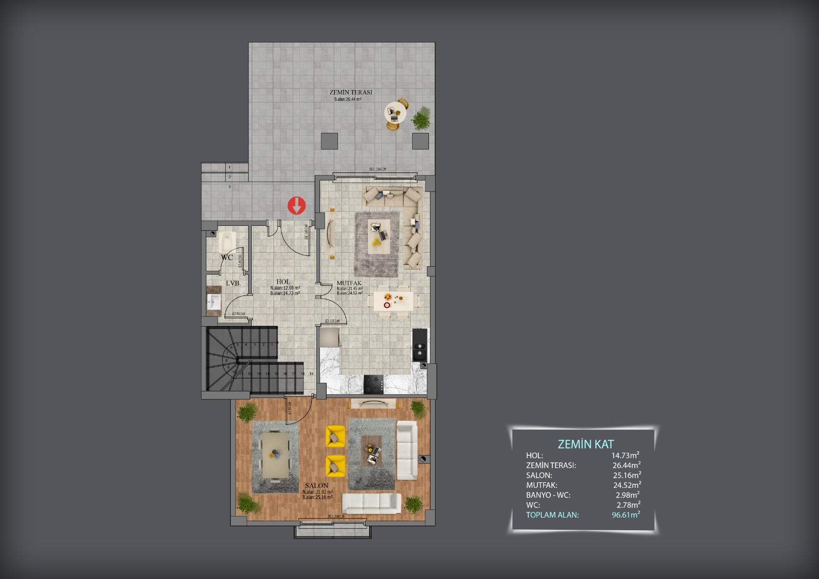 - 3 oda + salon modern yaşam planı
